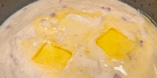 Grease a 6-quart crock pot or spray with nonstick cooking spray. Add potato mixture. Dot with butter or margarine. Cool slightly, cover and refrigerate up to 7 days.